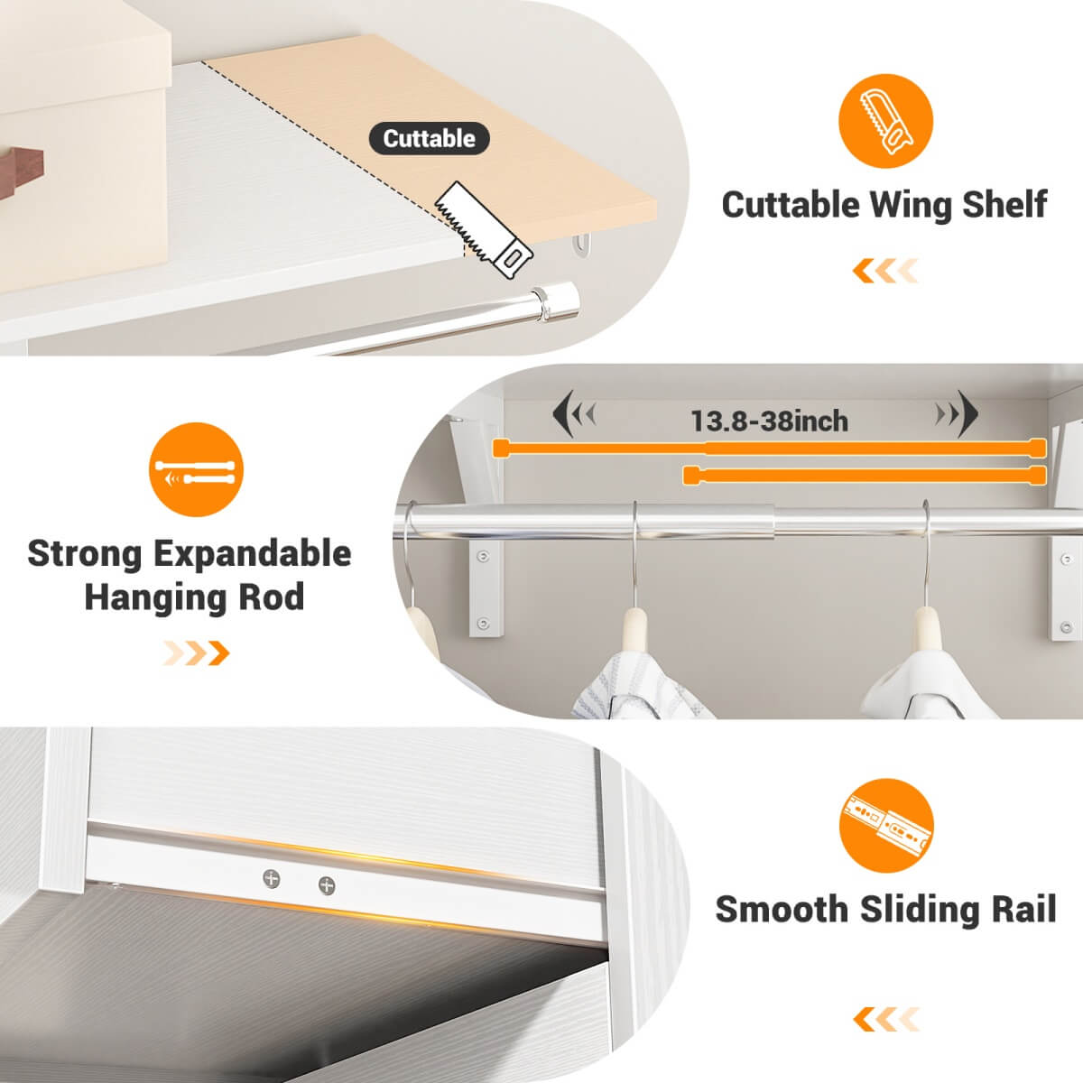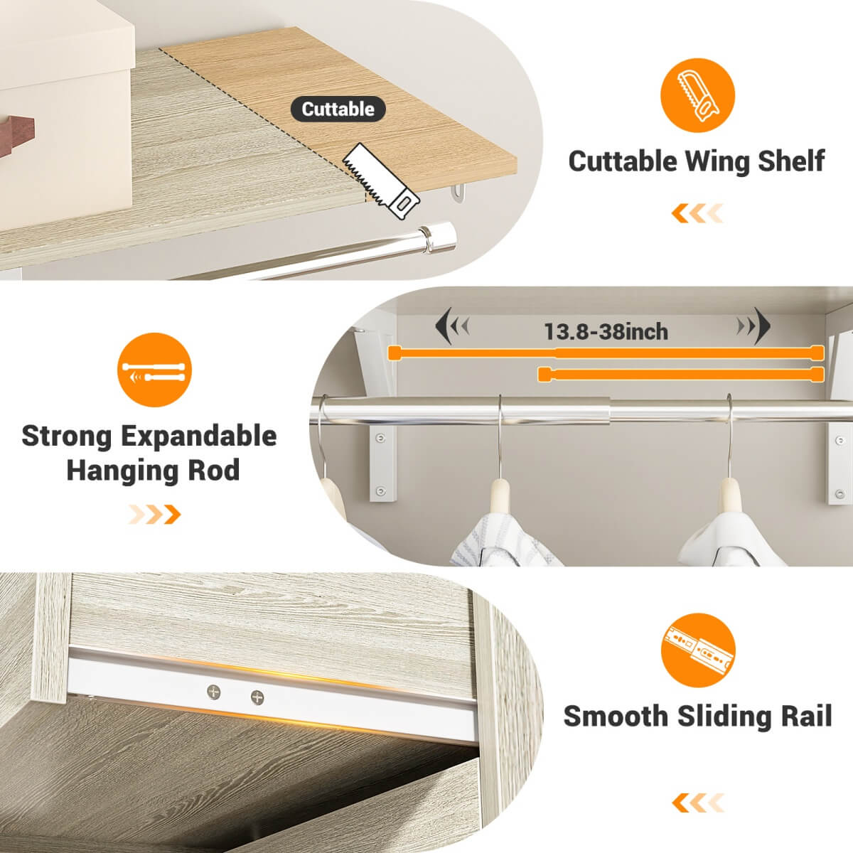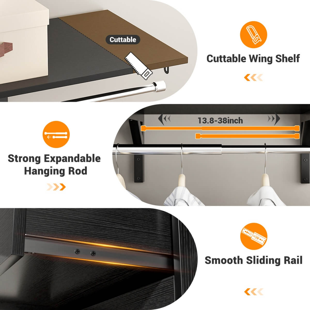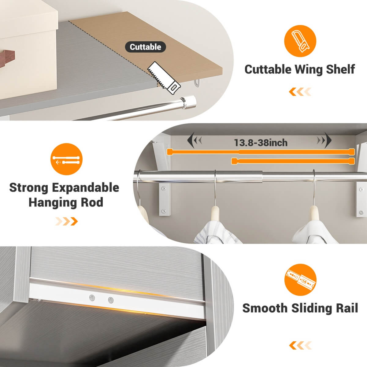 Customizable Design for Any Space: Adjustable hanging rod and detachable shelf tower adapt to wardrobes up to 96" wide for a perfect fit.
