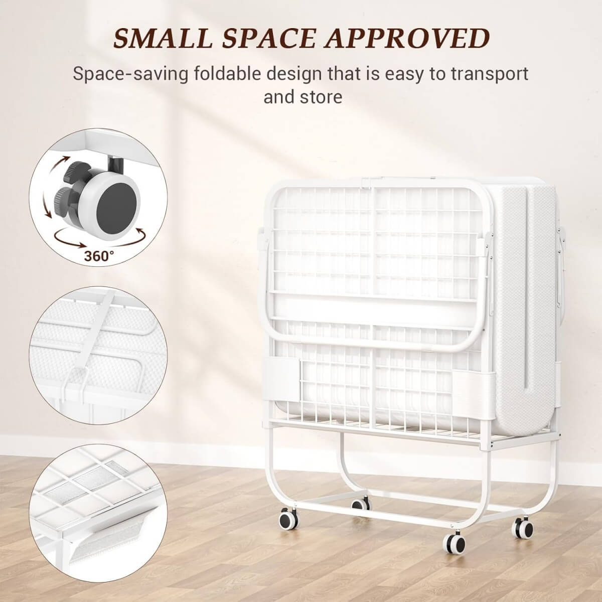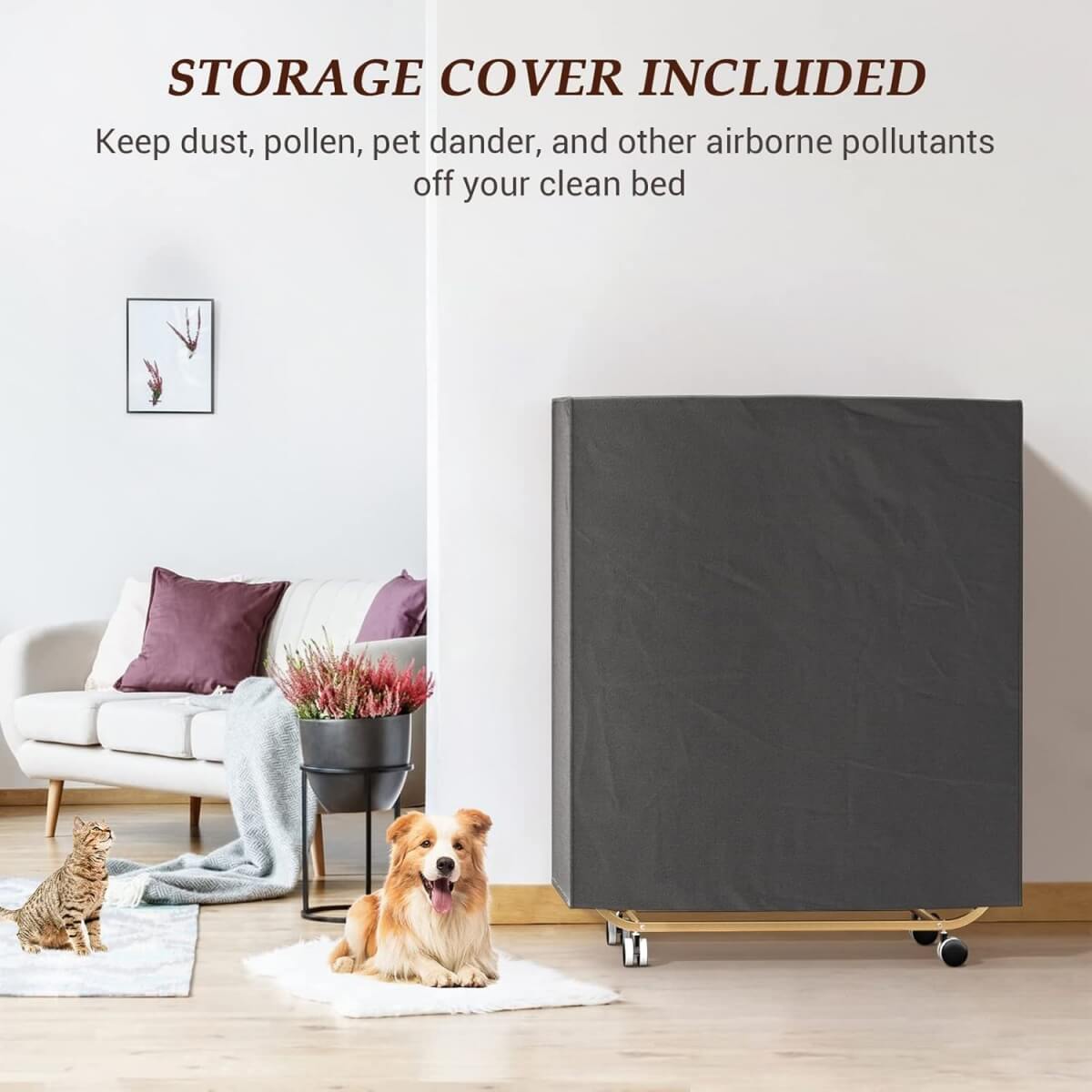 Multipurpose Folding Bed: Homieasy rollaway bed with mattress is great as a convenient extra guest bed when your friends and family come to visit, or as a daybed in the living room, or as a comfy camping bed during vacation or nap bed in the office. Foldable design that is easy to transport and store away when not in use. STORAGE COVER INCLUDED protects your roll-away bed from dirt, pet fur, and other pollutants.