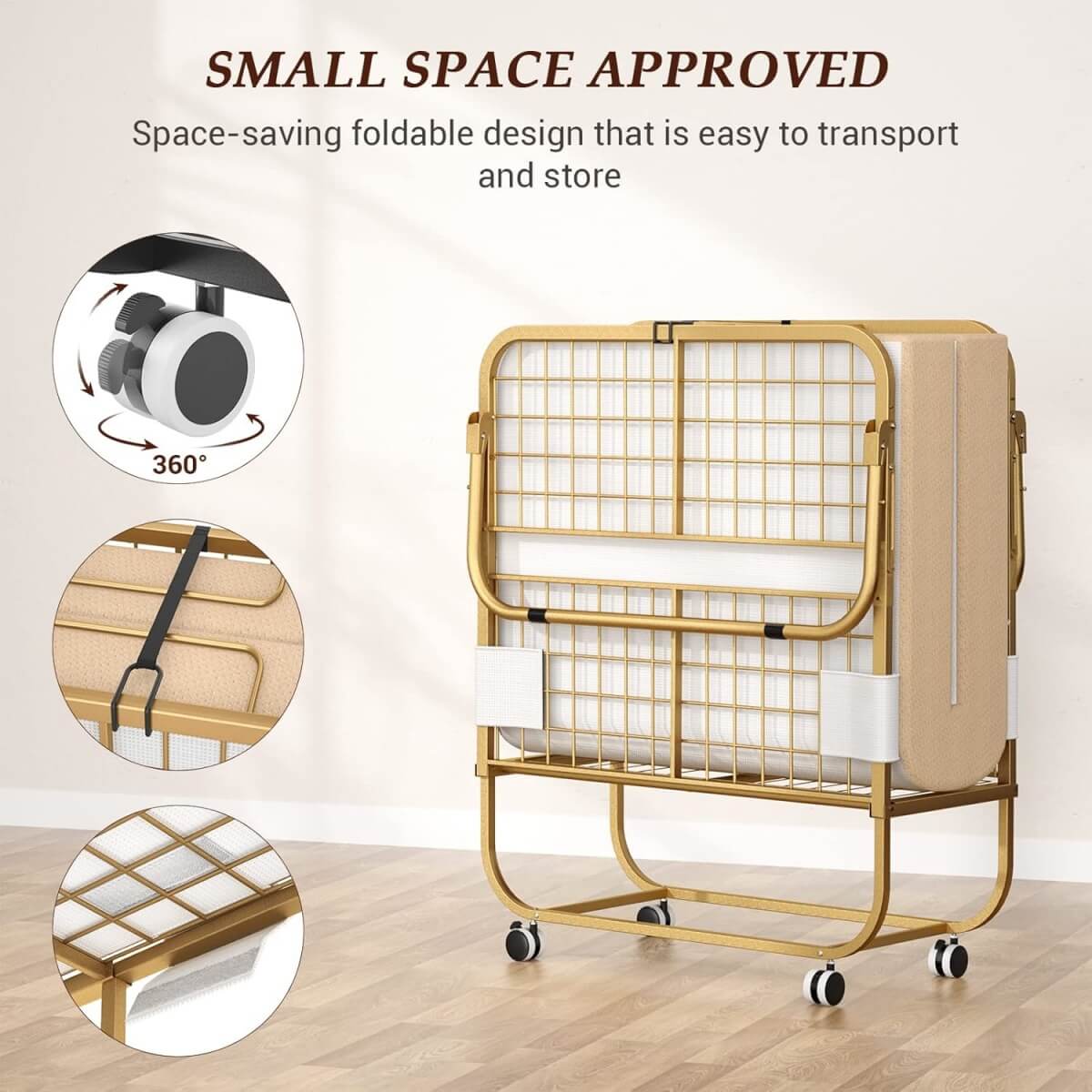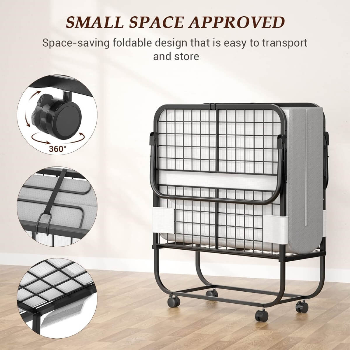 Space-Saving Foldable Design: Only 11.6" thick when it folded up make this bed is perfect for limited space. Simply fold the bed frame and stow it away in a closet. With the smooth flexible wheels, the portable folding bed can be easily moved from one room to another room by one person.