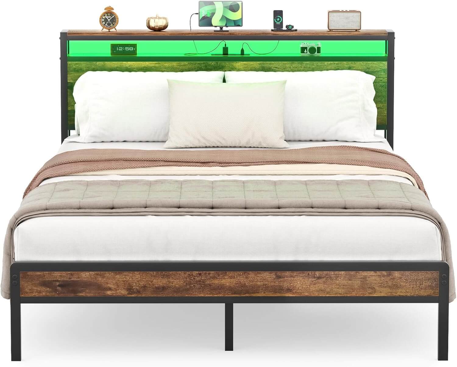 Storage Headboard with Charging Station - The bed frame comes with two storage shelves on the headboard that is perfect for putting books, tissue box, lamps, etc. With the built-in charging station: 3 power outlets and 2 USB ports added for convenience, you can charge your phone or tablet without having to leave the comfort of your bed.